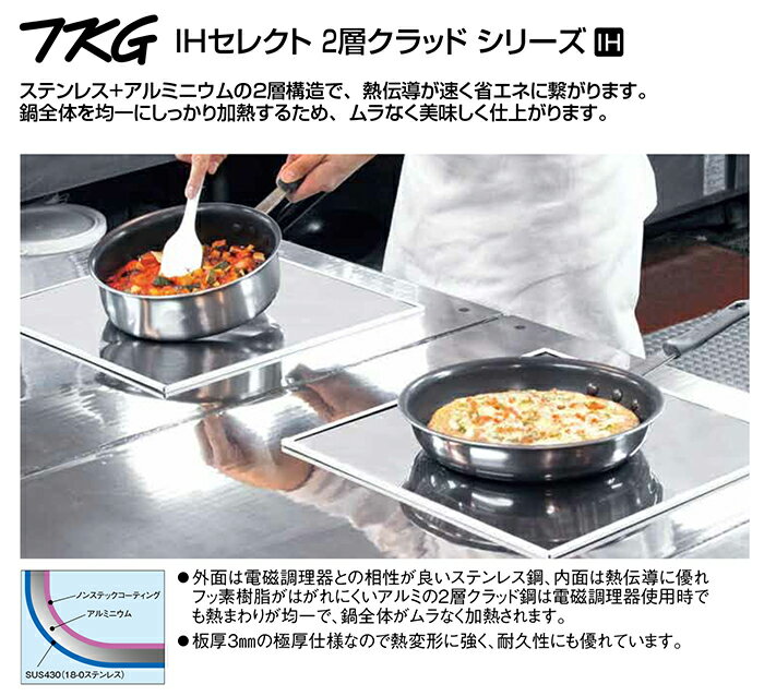 「TKG IHセレクト 2層クラッド 深型片手鍋 15cm」「TKG IHセレクト 2層クラッド 深型片手鍋 18cm」「TKG IHセレクト 2層クラッド 深型片手鍋 20cm」「TKG IHセレクト 2層クラッド 深型片手鍋 22cm」「TKG IHセレクト 2層クラッド 深型片手鍋 24cm(向い手付)」「TKG IHセレクト 2層クラッド 浅型片手鍋 15cm」「TKG IHセレクト 2層クラッド 浅型片手鍋 18cm」「TKG IHセレクト 2層クラッド 浅型片手鍋 20cm」「TKG IHセレクト 2層クラッド 浅型片手鍋 22cm」「TKG IHセレクト 2層クラッド 浅型片手鍋 24cm」「TKG IHセレクト 2層クラッド鍋用 ガラス蓋 15cm」「TKG IHセレクト 2層クラッド鍋用 ガラス蓋 18cm」「TKG IHセレクト 2層クラッド鍋用 ガラス蓋 20cm」「TKG IHセレクト 2層クラッド鍋用 ガラス蓋 22cm」「TKG IHセレクト 2層クラッド鍋用 ガラス蓋 24cm」